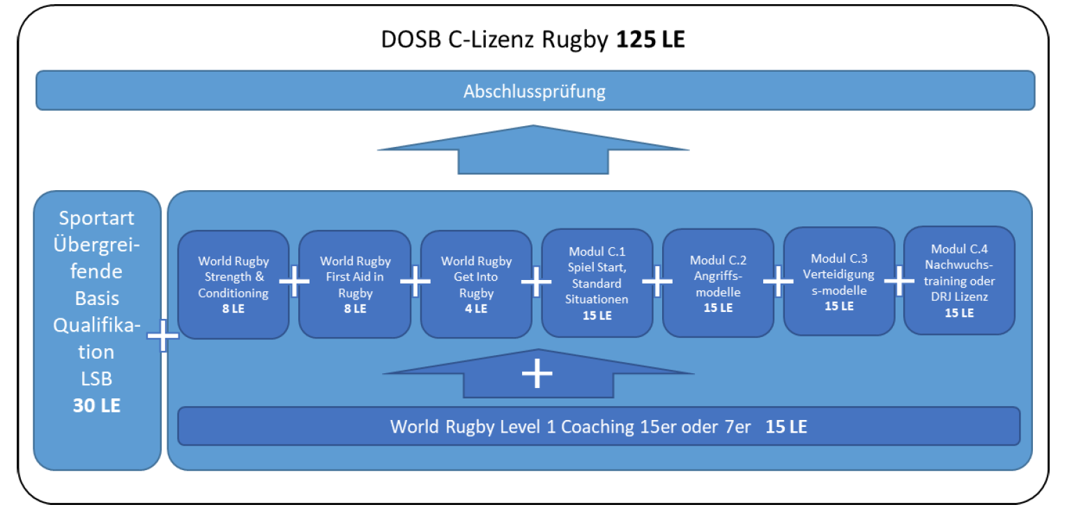 Diese Ausbildungsreihe ist ausschließlich für den Neuerwerb einer DOSB C-Trainer Lizenz Sportart Rugby konzipiert. Die Ausbildung muss in vollem Umfang und ohne Fehlzeiten absolviert werden. Eine Teilnahme an einzelnen Modulen zu Fortbildungs- bzw. Verlängerungszwecken ist nach Absprache mit der Ausbildungsleitung des anbietenden Landesverbands möglich.